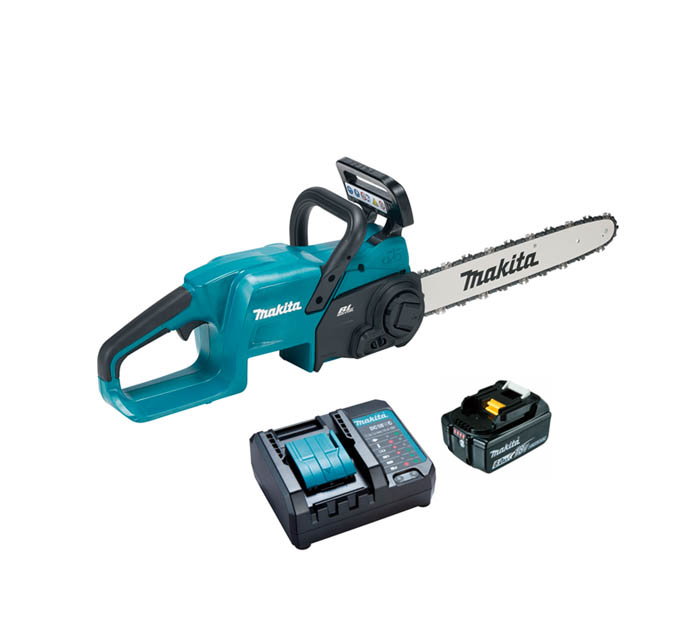 Motosierra Inalámbrica sin Escobillas (Brushless) BL de 40 cm (16") y 18V LXT. Excelente eficiencia de trabajo y acción de corte consistentemente potente. Se ha logrado un mayor torque de bloqueo al agregar un mecanismo de reducción de engranajes, permitiendo aplicaciones de servicio pesado como la operación de corte con la sierra presionada contra la madera. Mayor torque de bloqueo logrado al agregar un mecanismo de reducción de engranajes.