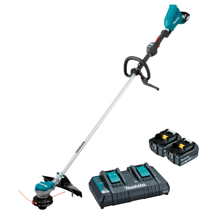 Desbrozadora Inalámbrica de 3 Velocidades LXT BL ADT AFT de 18V X2 (36V), Manillar tipo Bicicleta. 350 mm de ancho de corte con cabezal de corte de nylon para conveniencia del usuario. Ligera para reducir la fatiga del operador. El sistema de rotación Inversa permite al operador limpiar rápidamente el cabezal / la cuchilla de la desbrozadora de césped y malezas enredadas. Las opciones de 3 velocidades permiten al operador ajustar la velocidad a la aplicación. El control de velocidad Constante minimiza la reducción en la velocidad de rotación bajo carga. Manillar de bicicleta descentrado y ergonómicamente diseñado con agarre suave para la comodidad de los operadores y un protector más pequeño para mejor visibilidad.
