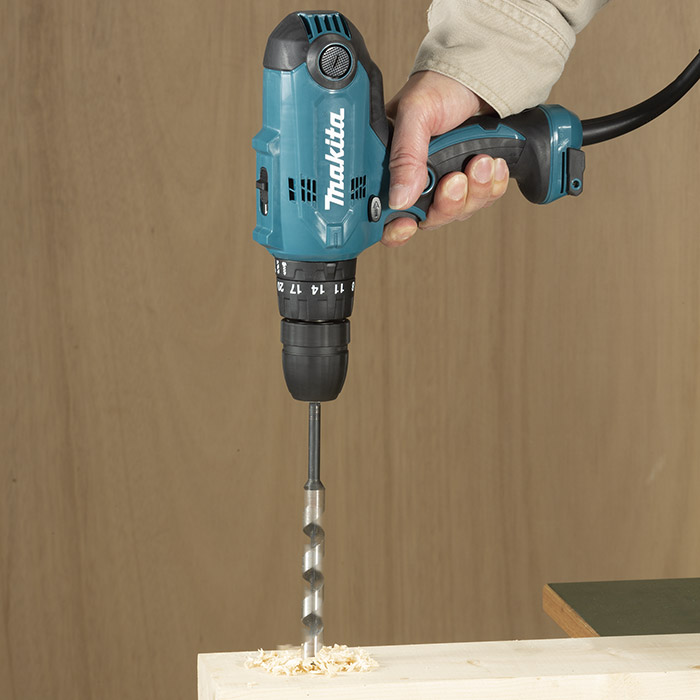 Taladro-Atornillador con Percusión de 10 mm (3/8"), 320 W con Mandril sin Llave Makita. Diseño Compacto con una longitud total corta, es un confiable mandril de taladro sin llave de doble casquillo de 10 mm para una fácil instalación y remoción de la broca. Engranaje mecánico de 2 velocidades; Modo de alta velocidad para taladrado rápido en aplicaciones ligeras; Modo de baja velocidad para aplicaciones pesadas que requieren alto torque, y operación de 2 modos para "Solo Rotación" o "Martilleo con Rotación" para múltiples aplicaciones. Escobillas de carbón accesibles desde el exterior para un fácil reemplazo.