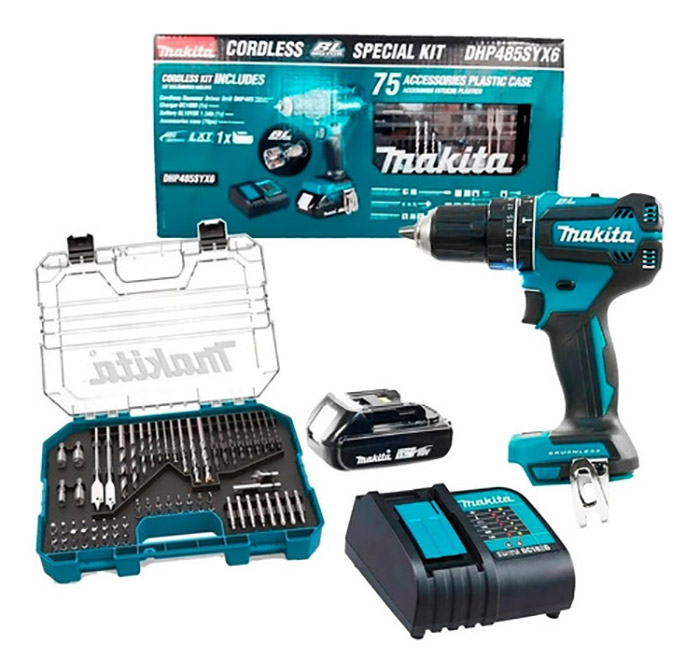 Taladro-Atornillador sin Escobillas (Brushless) de 18V LXT®. El DHP485 combina potencia y autonomía para más tareas de taladrado, atornillado y fijación en madera, metal y mampostería. El eficiente Motor BL™ sin Escobillas (Brushless) de Makita está controlado electrónicamente y diseñado para una mayor autonomía, mayor potencia y velocidad, y una vida útil más larga de la herramienta.