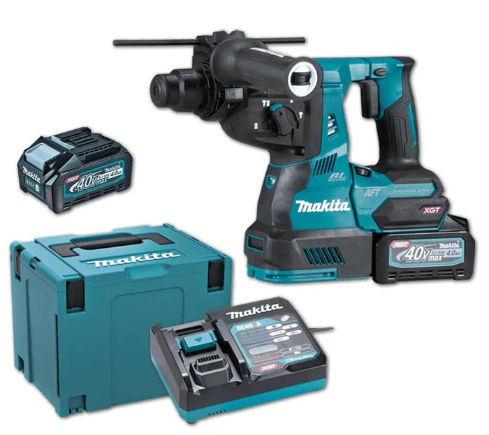 Rotomartillo Combinado Inalámbrico BL XGT de 40Vmax, 28 mm (1-1/8"), SDS-PLUS Makita, con excelente balance de la herramienta para un fácil manejo y Tecnología Anti-Vibración (AVT) para una vibración extremadamente baja. Operación de 3 modos para "Solo Rotación", "Martilleo con Rotación" o "Solo Martilleo". El mandril deslizable de un toque permite cambios de broca rápidos y fáciles, con un limitador de Torque que detiene la rotación si la broca se atasca para mayor seguridad del operador y mejor protección del motor.