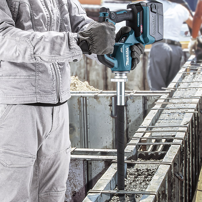 El Vibrador de Concreto Inalámbrico XGT de 40Vmax, 38 mm (1-1/2") Makita es compatible con ejes de gran diámetro y soporta un diámetro de parte vibratoria más grande que el modelo actual, y transmite la vibración a un rango más amplio para mejorar la eficiencia de compactación. Selección de dos modos de potencia (normal/potencia) y los ejes flexibles de ø28 a ø38 son adecuados para una amplia gama de lugares de trabajo, con eje Flexible ø38-1.2m o ø38-2.4m. Se puede acoplar una correa de hombro (se vende por separado). El mango de diseño ergonómico se adapta bien a su mano.