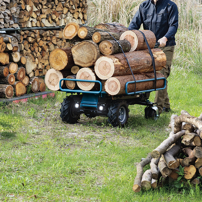 El Carretilla/Transportador de Materiales sin Escobillas (Brushless) de 36V (18V X2) LXT® con Chasis de Volteo/Tubería es una solución ideal para transportar materiales en lugares de trabajo y otros entornos. Ofrece hasta 100 minutos de autonomía (distancia equivalente a 4.5 millas). Cuenta con tres velocidades de avance y una de retroceso con velocidad variable controlada por un gatillo en cada rango. La velocidad máxima de avance es de 3 mph y una capacidad de carga máxima de 650 lbs. Cuenta con una plataforma de carga telescópica que se puede ajustar.